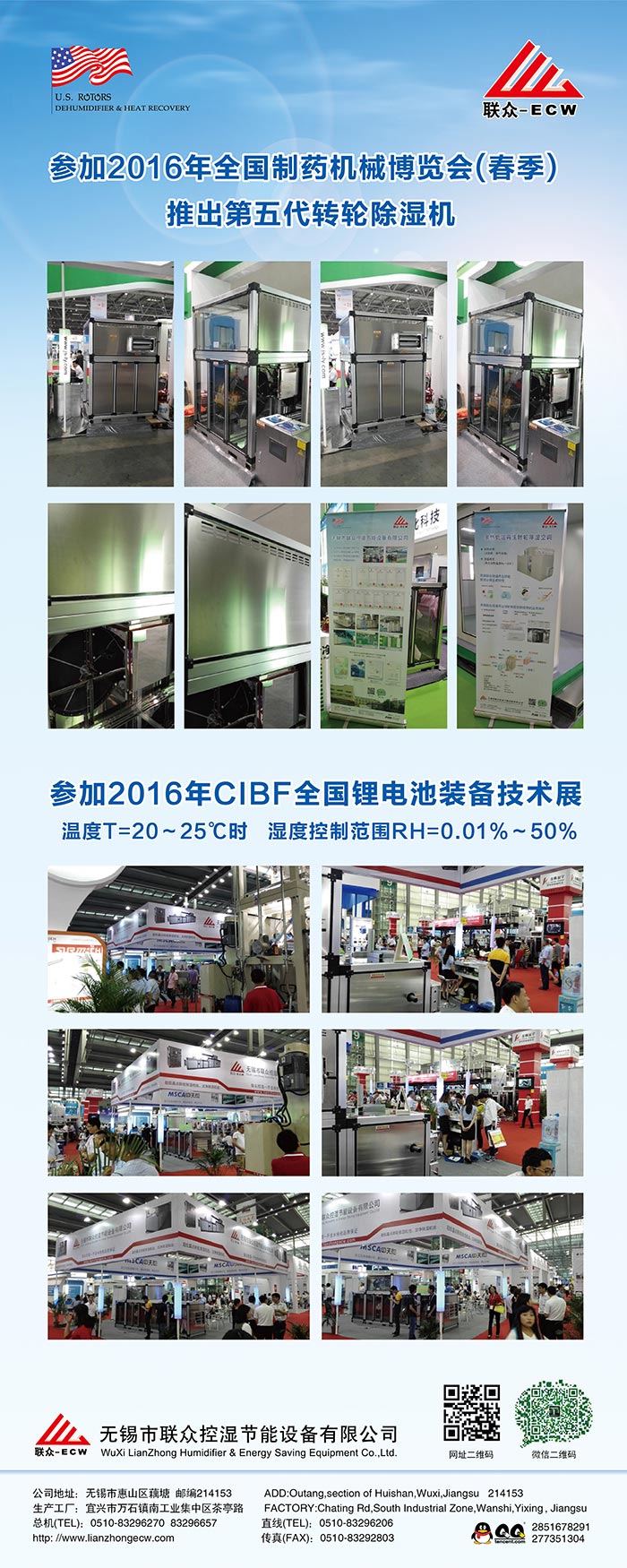 無錫市聯眾控濕節能設備有限公司成立于2004年2月,是一家長期致力于把空氣吸附分離技術應用于空氣處理設備的科技型中外合作 企業,主要研發生產轉輪除濕機組、熱泵除濕機組、空氣與空氣熱 能交換回收機組、蒸發冷卻空調機組、有機廢氣凈化處理機組等非 標空氣處理設備。隨著生產規模的不斷壯大和產業化的精細分工, 聯眾公司與2011年10月在江蘇省宜興市萬石鎮工業園茶亭路8號, 一期投資5000萬元,置地25畝、建標準工業廠房10000平方米和辦 公樓3000平方米,重新注冊成立江蘇聯眾聯勝節能設備有限公司。 企業領導層決定確立江蘇聯眾聯勝公司以研發生產蒸發冷卻空調機 組、有機廢氣凈化處理機組等大型節能環??諝馓幚碓O備為主;而無錫聯眾控濕公司則在無錫繼續以研發生產轉輪除濕機組、熱泵除濕機組、空氣與空氣熱交器為主。在國內暖通空調工程領域,聯眾控濕公司研發各類轉輪除濕機的技術能力、生產各類轉輪除濕機的 裝備制造工藝水平處于本行業前沿。